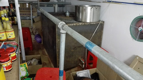 电梯周边未设立警戒范围和安全警示标志,每层楼的进货通道与电梯连接处未采取防护措施。