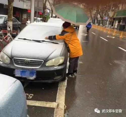 武汉停车人在车主要走时,看到车窗被雪花遮盖,主动用双手去帮助车主擦去雪花,用真情感动了车主。