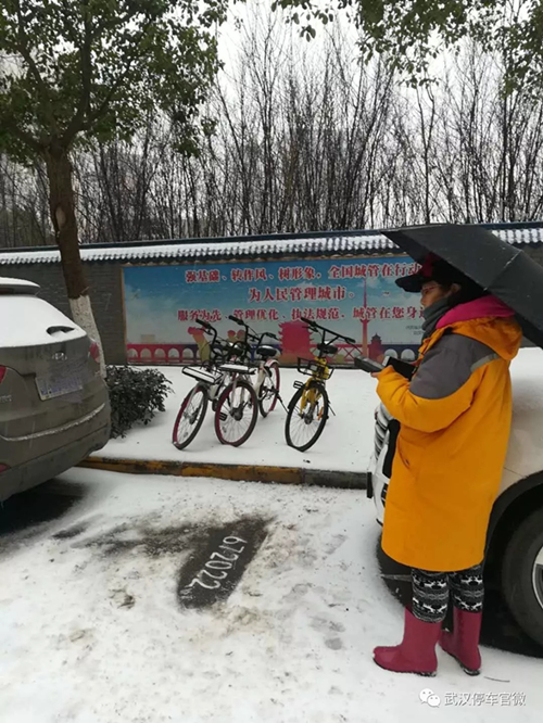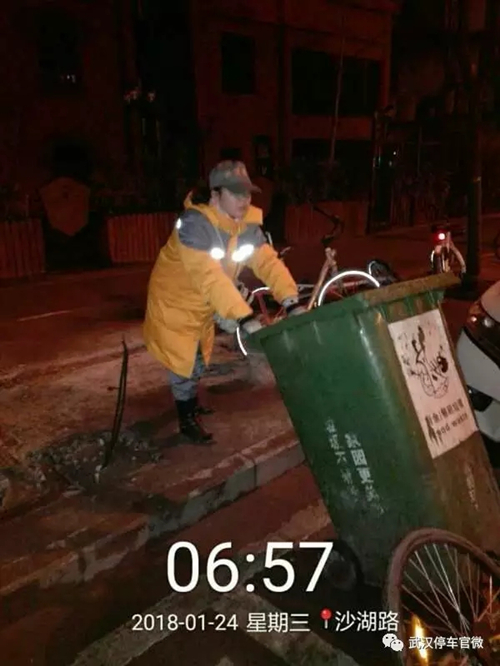 武汉停车人清晨不畏严寒收拾泊位上的垃圾以及单车。