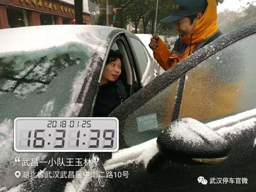 顶着风雪,武汉停车人面带微笑的为车主介绍“武汉停车”,并指导车主下载武汉停车APP,贴心为车主解答疑问。