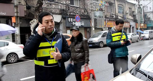 武汉停车稽查人员在街道上进行巡查,整治机动车道路停车秩序。