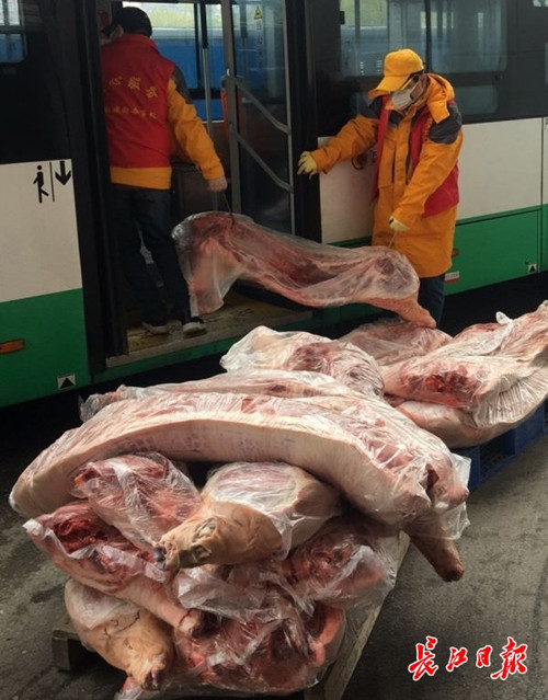 2月26日8点半,“武汉停车”下沉青扬社区的队员一到岗,就接到青扬社区党总支书记褚琦下达的一项特殊任务:中百超市有15头已宰杀的生猪需要转运到红钢城街道仓库,分装后再运回社区派送。接到任务后,组长彭涌就带领屈国庆、陈佩、朱玉龙等队员马不停蹄地赶往集合地点,搭乘社区安排的公交车来到中百超市。