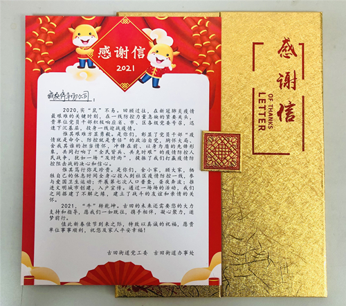 为此,古一社区转赠了来自古田街道党工委的感谢信,充分肯定了停车场公司在疫情防控常态化期间积极、主动作为,踊跃参与到街道、社区各项志愿工作中,取得了显著成效。“惟其艰难方显勇毅,惟其笃行弥足珍贵”,公司党委将一如既往,凝心聚力,与古一社区一起携手并进,为构筑共建共治共享的社区治理新格局作出应有的贡献。